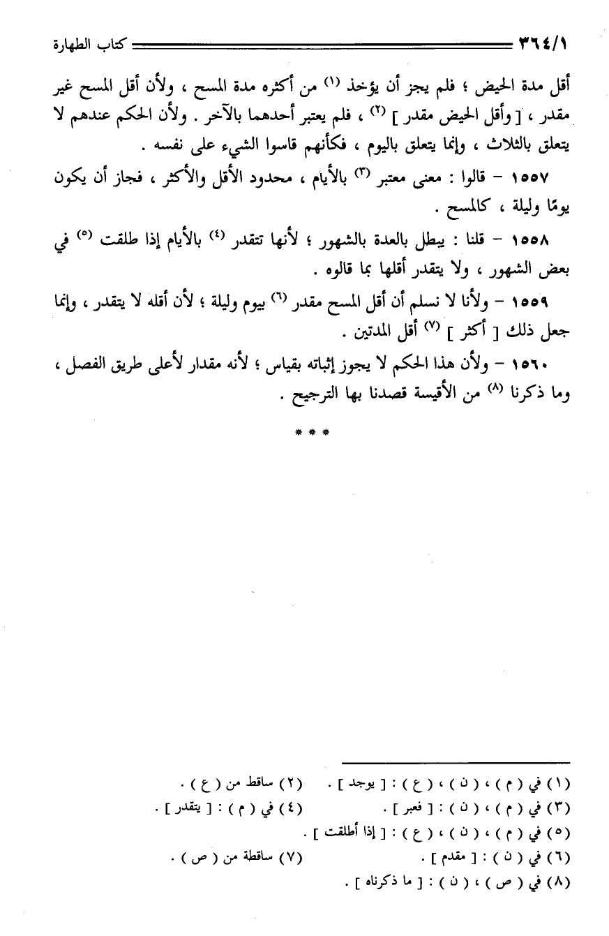 1559 - ولأنا لا نسلم أن أقل المسح مقدر بيوم وليلة؛ لأن أقله لا يتقدر، وإنما جعل ذلك أكثر أقل المدتين.