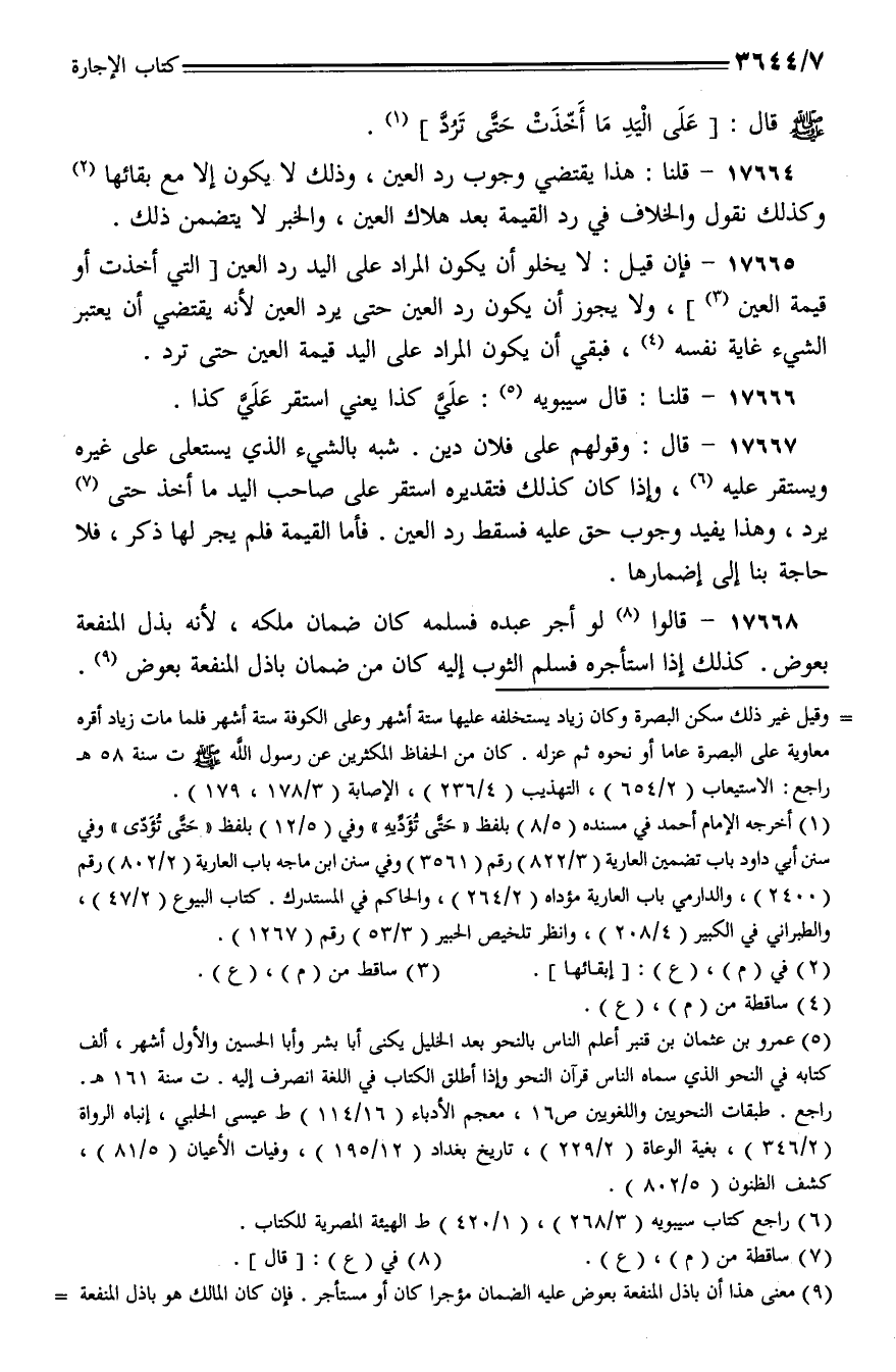 17667 - قال: وقولهم على فلان دين. شبه بالشيء الذي يستعلى على غيره ويستقر عليه، وإذا كان كذلك فتقديره استقر على صاحب اليد ما أخذ حتى يرد، وهذا يفيد وجوب حق عليه فسقط رد العين. فأما القيمة فلم يجر لها ذكر، فلا حاجة بنا إلى إضمارها.