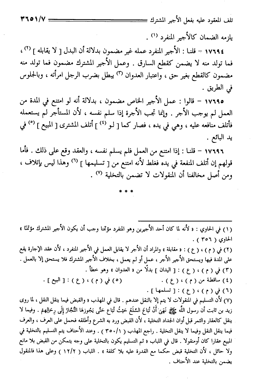 17694 - قلنا: الأجير المنفرد عمله غير مضمون بدلالة أن البدل [لا يقابله]، فما تولد منه لا يضمن كقطع السارق. وعمل الأجير المشترك مضمون فما تولد منه مضمون كالقطع بغير حق، واعتبار العدوان يبطل بضرب الرجل امرأته، وبالجلوس في الطريق.