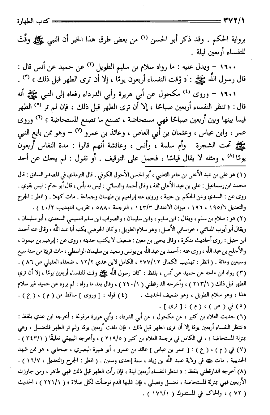 1600 - ويدل عليه: ما رواه سلام بن سليم الطويل عن حميد عن أنس قال: قال رسول الله - صلى الله عليه وسلم -: ((وُقت النفساء أربعون يومًا، إلا أن ترى الطهر قبل ذلك)).