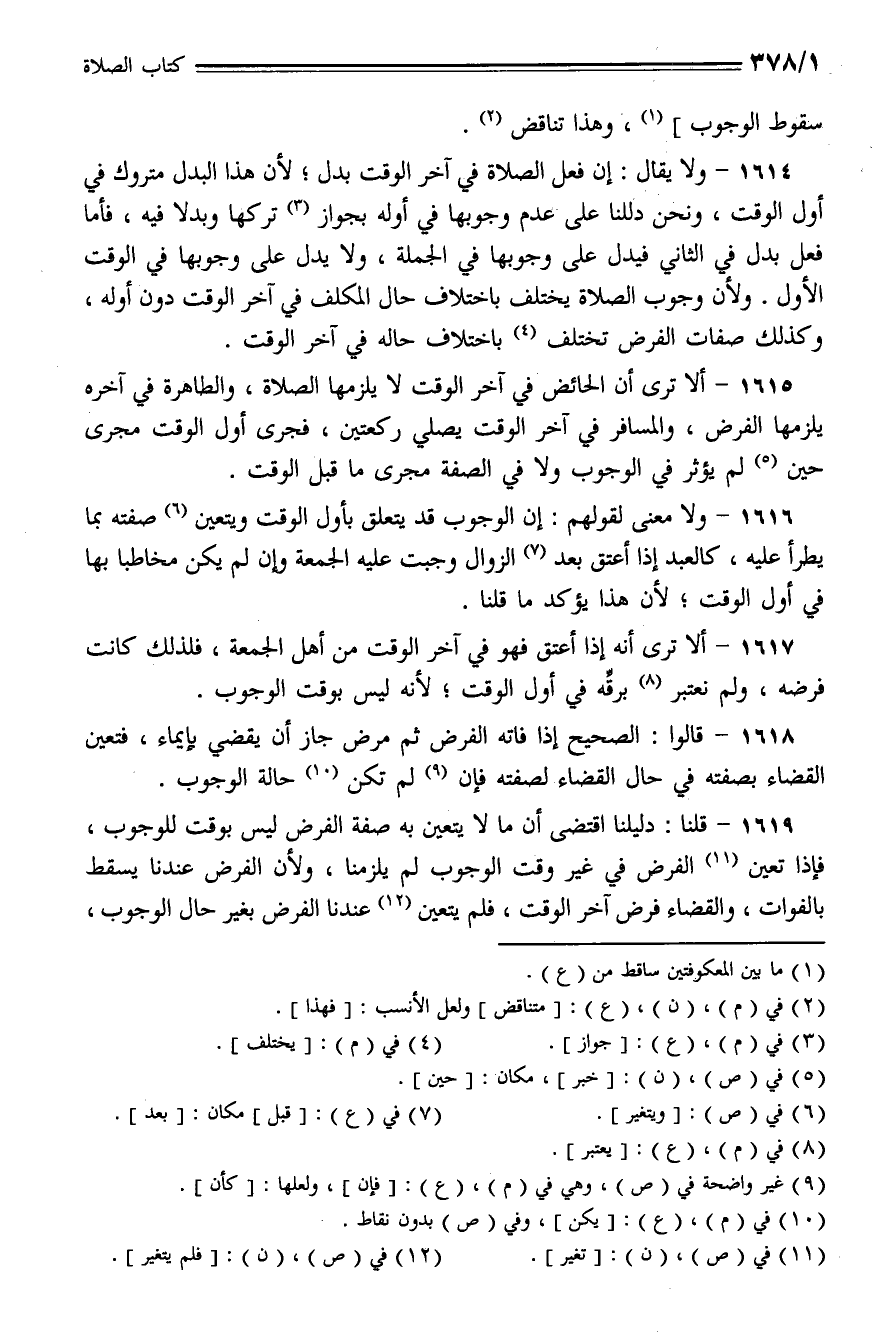 1616 - ولا معنى لقولهم: إن الوجوب قد يتعلق بأول الوقت ويتعين صفته بما يطرأ عليه، كالعبد إذا أعتق بعد الزوال وجبت عليه الجمعة وإن لم يكن مخاطبا بها في أول الوقت؛ لأن هذا يؤكد ما قلنا.