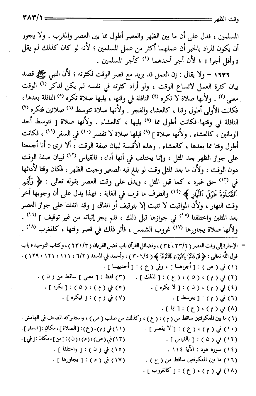1636 - ولا يقال: إن العمل قد يزيد مع قصر الوقت لكثرته؛ لأن النبي - صلى الله عليه وسلم - قصد بيان كثرة العمل لاتساع الوقت، ولو أراد كثرته في نفسه لم يكن لذكر الوقت معنى. ولأنها صلاة لا تكره النافلة في وقتها، يليها صلاة تكره النافلة بعدها، فكانت الأولى أطول وقتا، كالعشاء والفجر. ولأنها صلاة تتوسط صلاتين فتكره النافلة في وقتها فكانت أطول مما يليها، كالعشاء. ولأنها صلاة تتوسط أحد الزمانين، كالعشاء. ولأنها صلاة قبلها صلاة لا تقصر في السفر، فكانت أطول وقتا مما بعدها، كالعشاء. وهذه الأقيسة لبيان سفة الوقت، ألا ترى: أنا أجمعنا على جواز الظهر بعد المثل، وإنما يختلف في أنها أداء، فالقياس لبيان صفة الوقت دون الوقت، ولأن ما بعد المثل وقت لو بلغ فيه الصغير وجبت الظهر، فكان وقتا لأدائها في حق غيره، كما قبل المثل، ويدل على وقت العصر بقوله تعالى: {وأقم الصلاة طرفي النهار} والطرف ما قرب من الغاية، فهذا يدل على أن وجوبها آخر وقت النهار، ولأن الواقيت لا تثبت إلى بتوقيف أو اتفاق وقد اتفقنا على جواز العصر بعد المثلين واختلفنا في جوازها قبل ذلك، فلم يجز إثباته من غير توقيف. ولأنها صلاة يجاورها غروب الشمس، فأثر ذلك في قصر وقتها، كالمغرب.