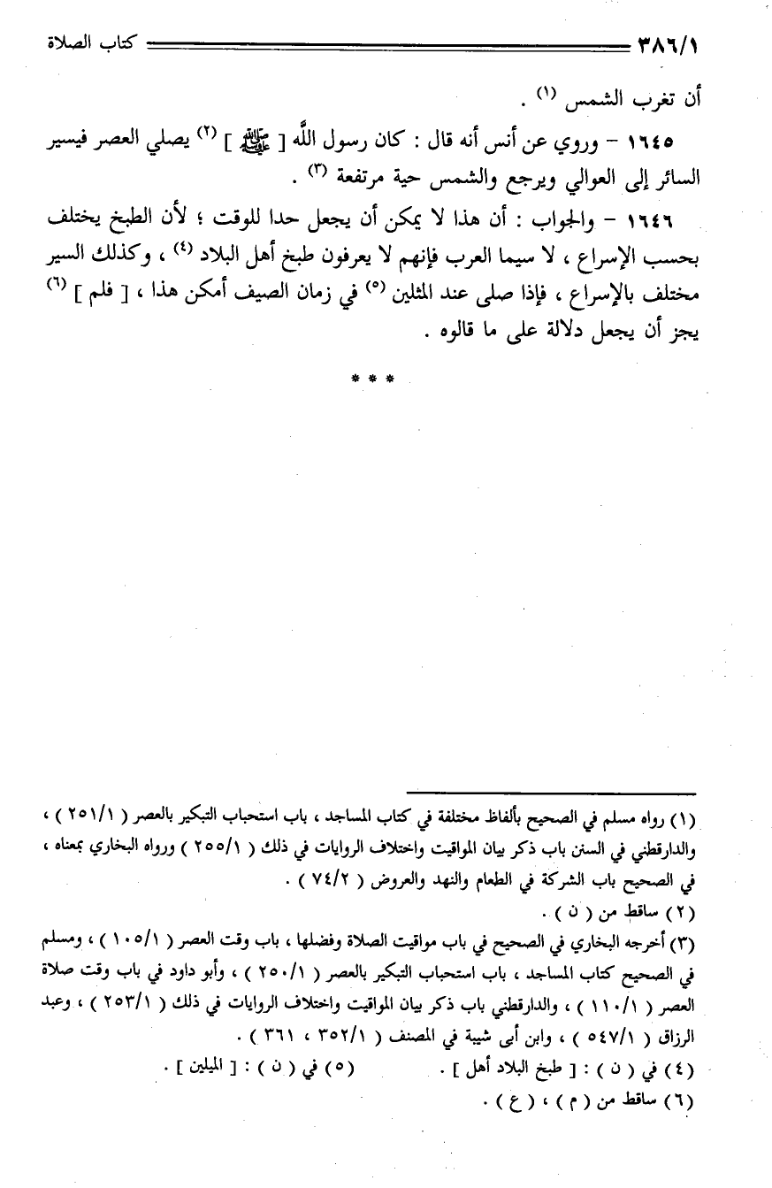 1645 - وروي عن أنس أنه قال: كان رسول الله - صلى الله عليه وسلم - يصلي العصر فيسير السائر إلى العوالي ويرجع والشمس حية مرتفعة.