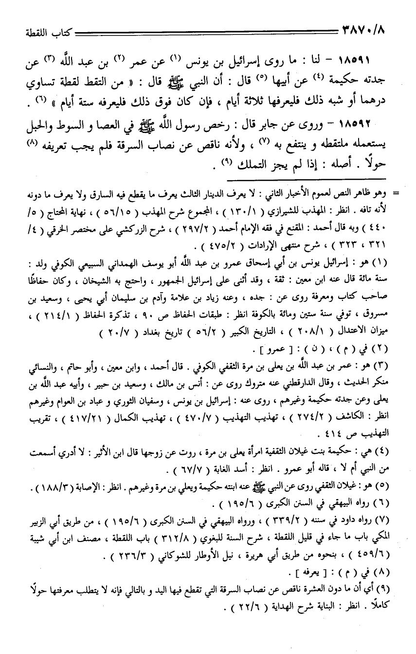 18591 - لنا: ما روى إسرائيل بن يونس عن عمر بن عبد الله عن جدته حكيمة عن أبيها قال: أن النبي - صلى الله عليه وسلم - قال: (من التقط لقطة تساوي درهما أو شبه ذلك فليعرفها ثلاثة أيام، فإن كان فوق ذلك فليعرفه ستة أيام).