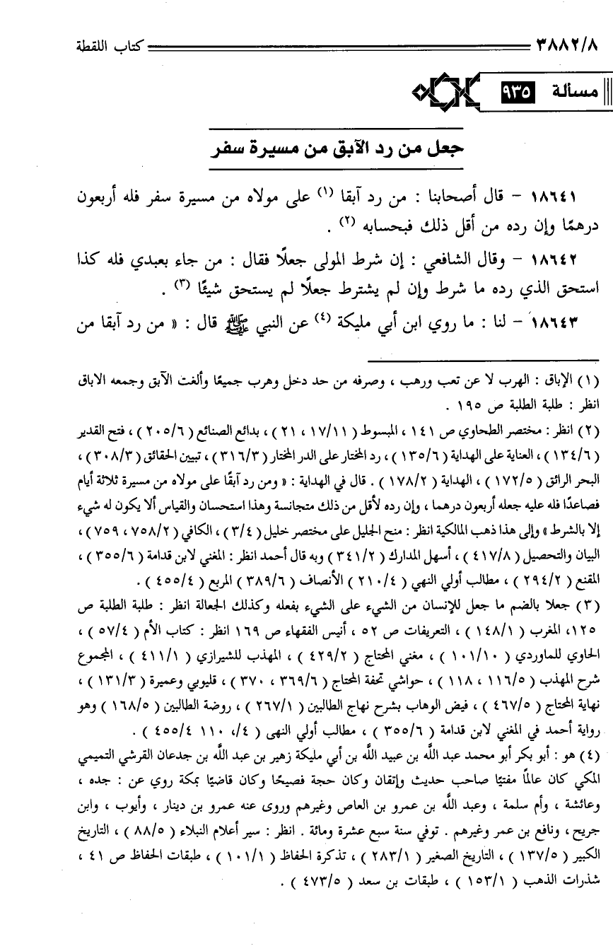 18641 - قال أصحابنا: من رد آبقا على مولاه من مسيرة سفر فله أربعون درهمًا وإن رده من أقل ذلك فبحسابه.