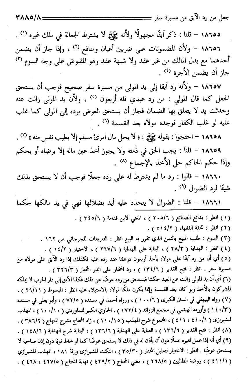 18657 - ولأنه رد آبقا إلى يد المولى من مسيرة سفر صحيح فوجب أن يستحق الجعل كما قال المولى: من رد عبدي فله أربعون، ولأن يد المولى زالت عنه وحدثت يد لا يتعلق بها الضمان فجاز أن يستحق العوض برده إلى المولى كما غلب عليه لو غلب الكفار فوجده مولاه بعد القسمة.