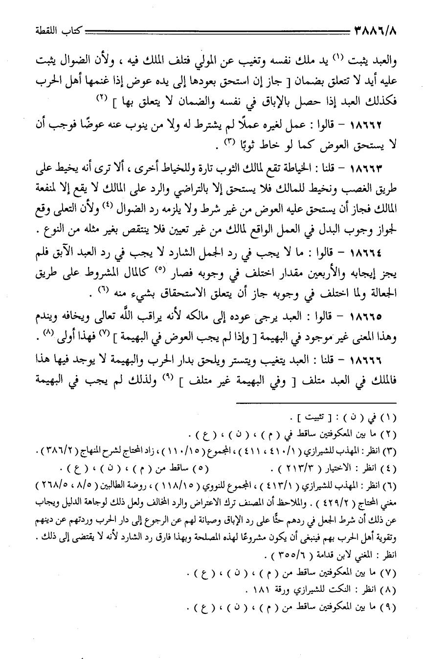 18666 - قلنا: العبد يتغيب ويتستر ويلحق بدار الحرب والبهيمة لا يوجد فيها هذا فالملك في العبد متلف [وفي البهيمة غير متلف] ولذلك لم يجب في البهيمة