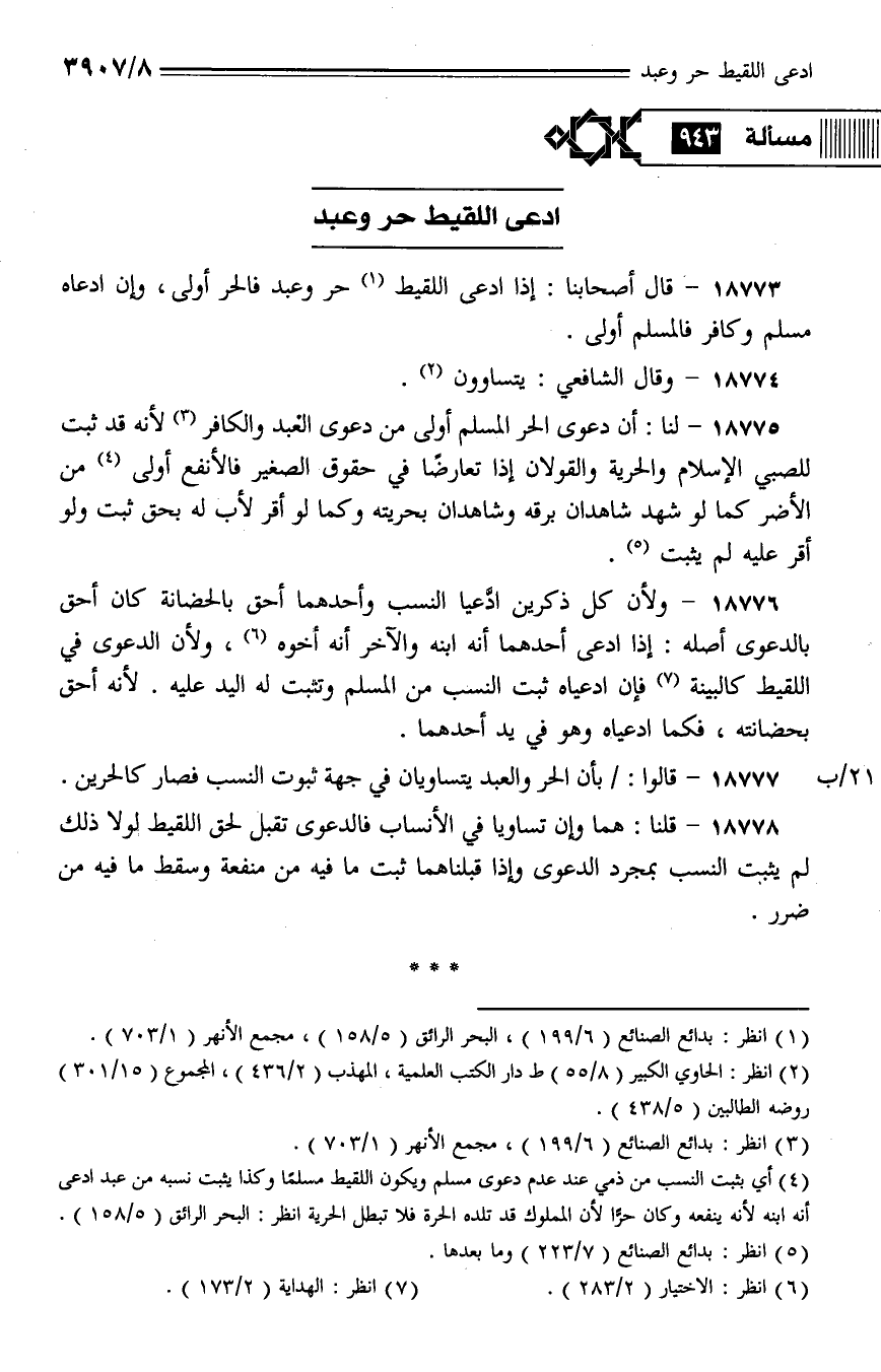18777 - قالوا: بأن الحر والعبد يتساويان في جهة ثبوت النسب فصار كالحرين.