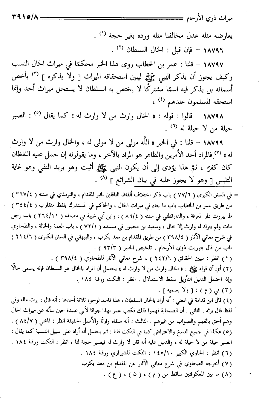 18797 - قلنا: عمر بن الخطاب روى هذا الخبر محكما في ميراث الخال النسب وكيف يجوز أن يذكر النبي - صلى الله عليه وسلم - ليبين استحقاقه الميراث [ولا يذكره] بأخص أسمائه بل يذكر فيه اسما مشتركا لا يختص به السلطان لا يستحق ميراث أحد وإنما استحقه المسلمون عندهم،