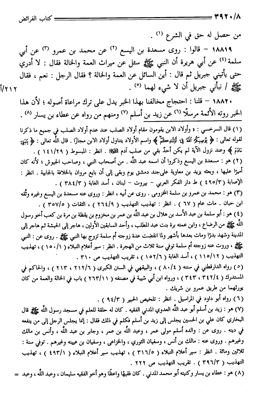 18819 - قالوا: روى مسعدة بن اليسع عن محمد بن عمرو عن أبي سلمة عن أبي هريرة أن النبي - صلى الله عليه وسلم - سئل عن ميراث العمة والخالة فقال: لا أدري حتى يأتيني جبريل ثم قال: أين السائل عن العمة والخالة؟ فقال الرجل: نعم، فقال - صلى الله عليه وسلم - نبأني جبريل أن لا شيء لهما.