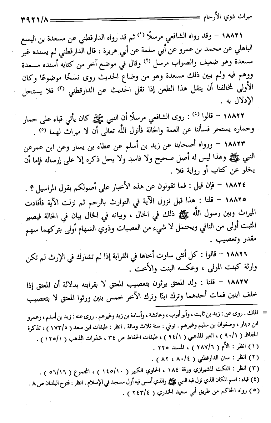 18822 - قالوا: روى الشافعي مرسلا أن النبي - صلى الله عليه وسلم - كان يأتي قباء على حمار وحماره يستحر فسألنا عن العمة والخالة فأنزل الله تعالى أن لا ميراث لهما.
