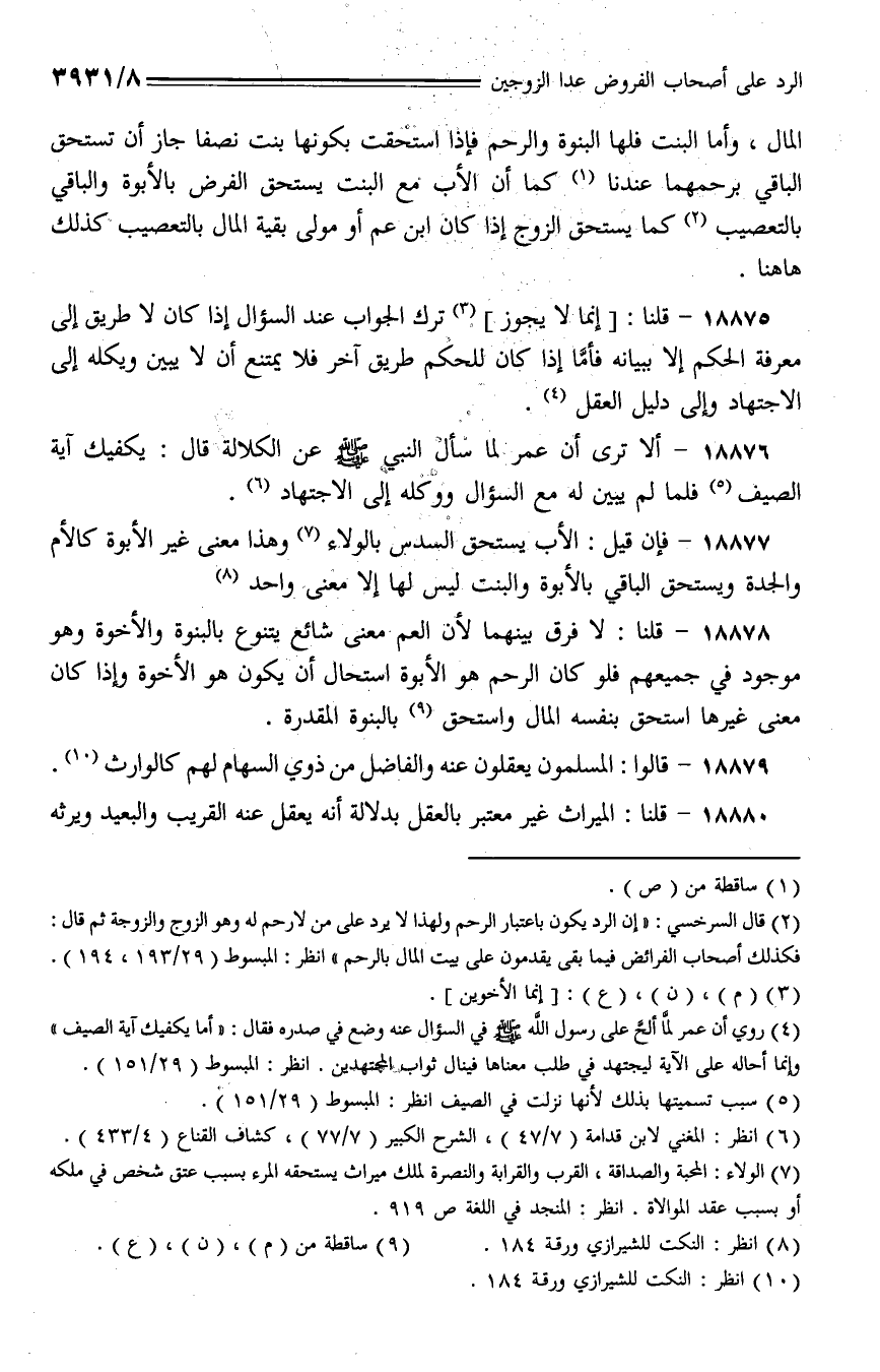 18879 - قالوا: المسلمون يعقلون عنه والفاضل من ذوي السهام لهم كالوارث