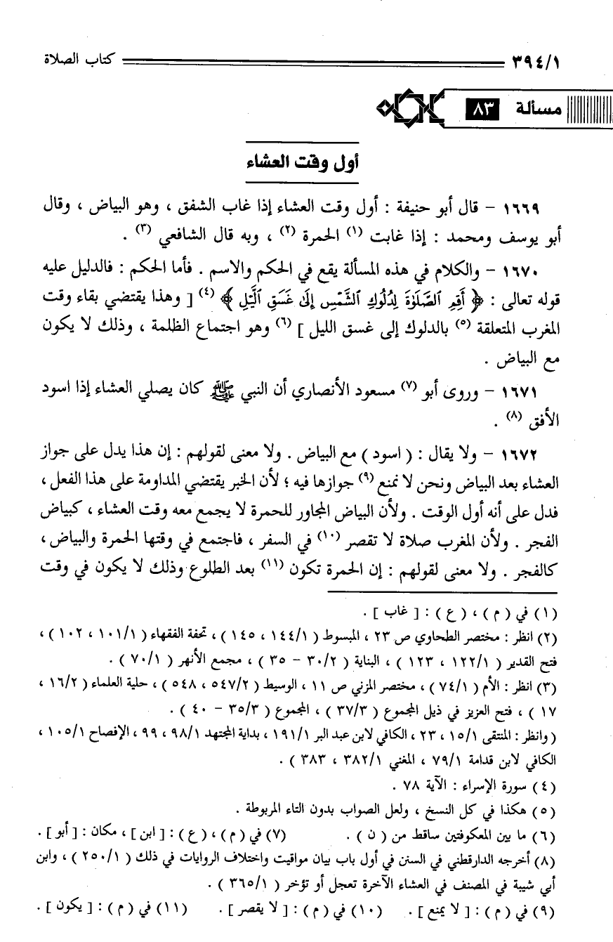 1669 - قال أبو حنيفة: أول وقت العشاء إذا غاب الشفق، وهو البياض، وقال أبو يوسف ومحمد: إذا غابت الحمرة، وبه قال الشافعي.