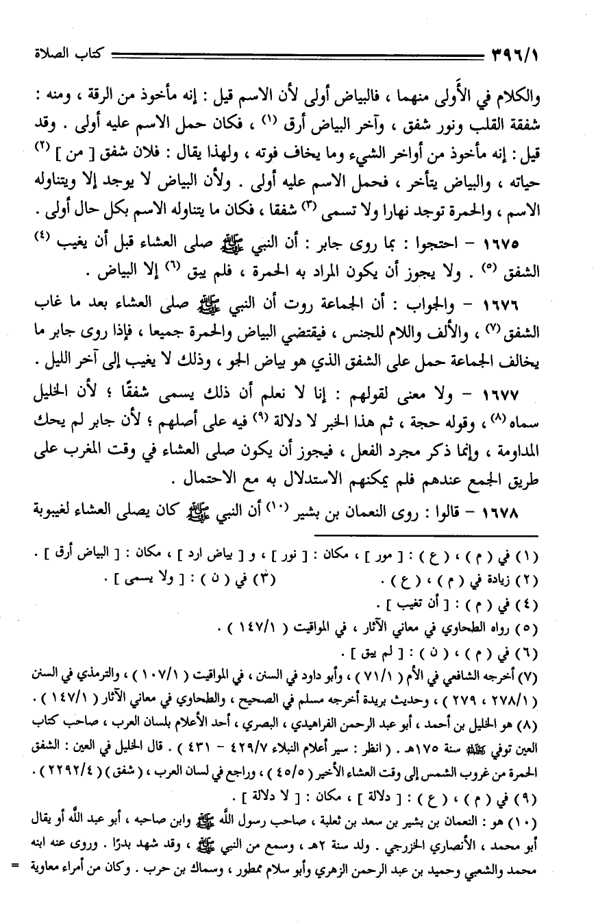 1676 - والجواب: أن الجماعة روت أن النبي - صلى الله عليه وسلم - صلى العشاء بعد ما غاب الشفق، والألف واللام للجنس، فيقتضي البياض والحمرة جميعا، فإذا روى جابر ما يخالف الجماعة حمل على الشفق الذي هو بياض الجو، وذلك لا يغيب إلى آخر الليل.