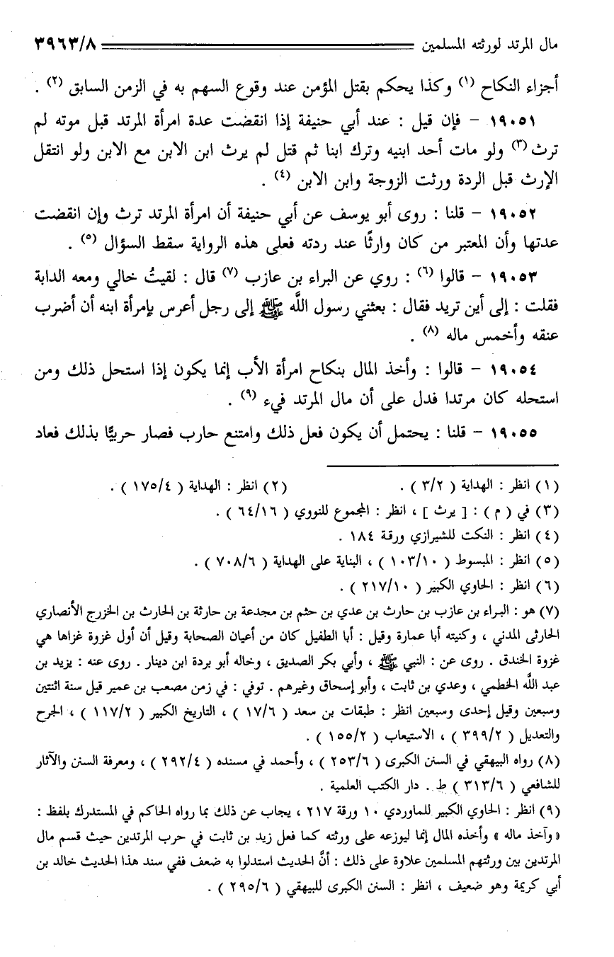 19053 - قالوا: روي عن البراء بن عازب قال: لقيت خالي ومعه الدابة فقلت: إلى أين تريد فقال: بعثني رسول الله - صلى الله عليه وسلم - إلى رجل أعرس بإمرأة ابنه أن أضرب عنقه وأخمس ماله.