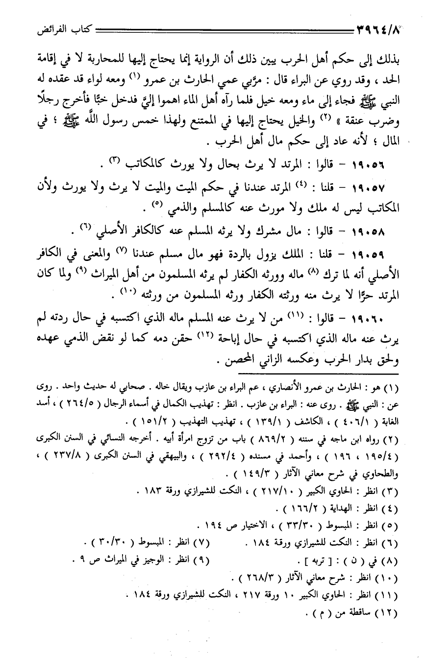 19060 - قالوا: من لا يرث عنه المسلم ماله الذي اكتسبه في حال ردته لم يرث عنه ماله الذي اكتسبه في حال إباحة حقن دمه كما لو نقض الذمي عهده ولحق بدار الحرب وعكسه الزاني المحصن.