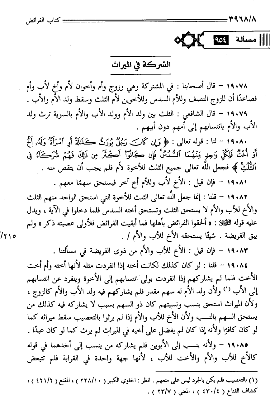 19087 - قال أصحابنا: في المشتركة وهي وزوج وأم وأخوان لأم وأخ لأب وأم فصاعدا أن للزوج النصف وللأم السدس وللأخوين لأم الثلث وسقط ولد الأم والأب.