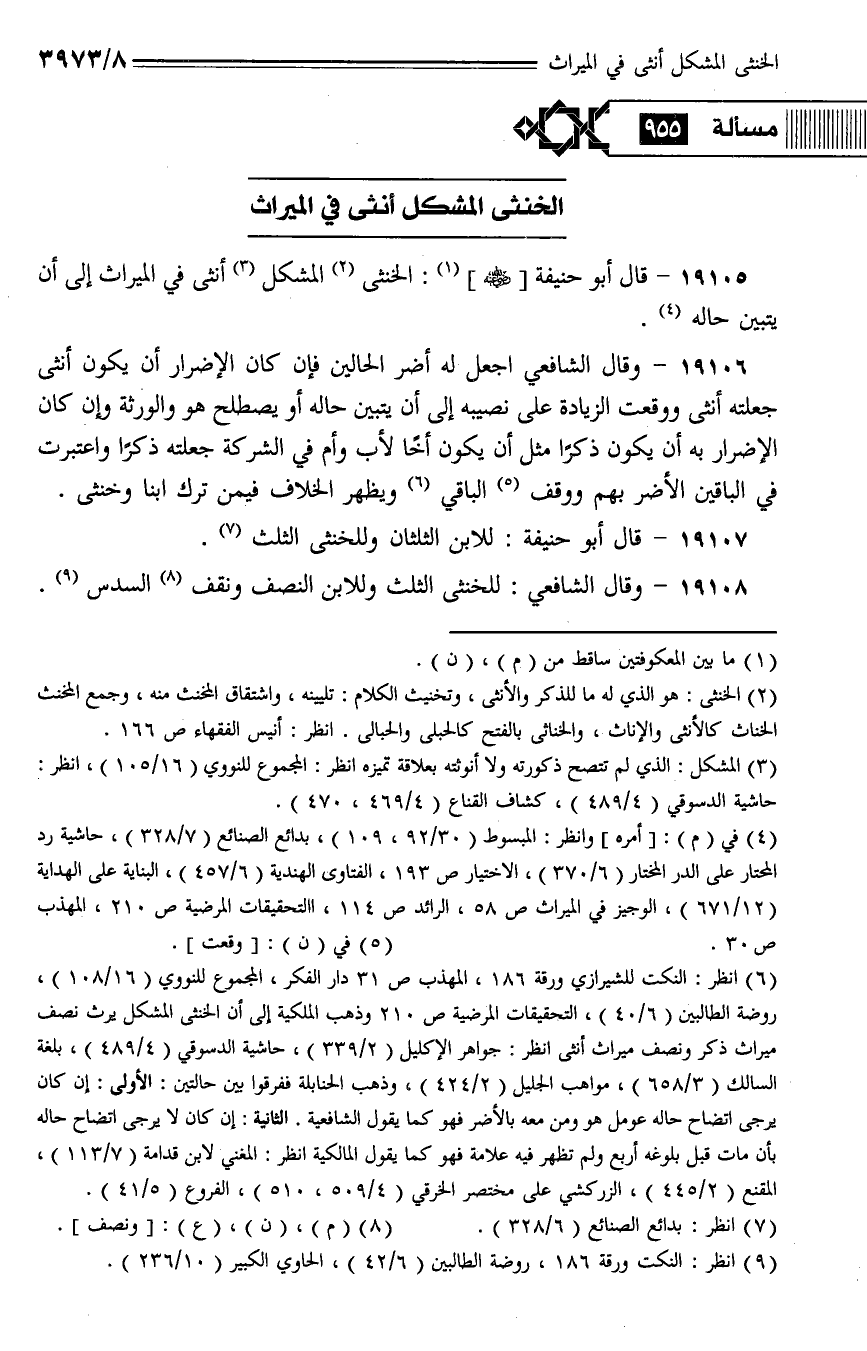 19105 - قال أبو حنيفة [- رضي الله عنه -]: الخنثى المشكل أنثى في الميراث إلى أن يتبين حاله.