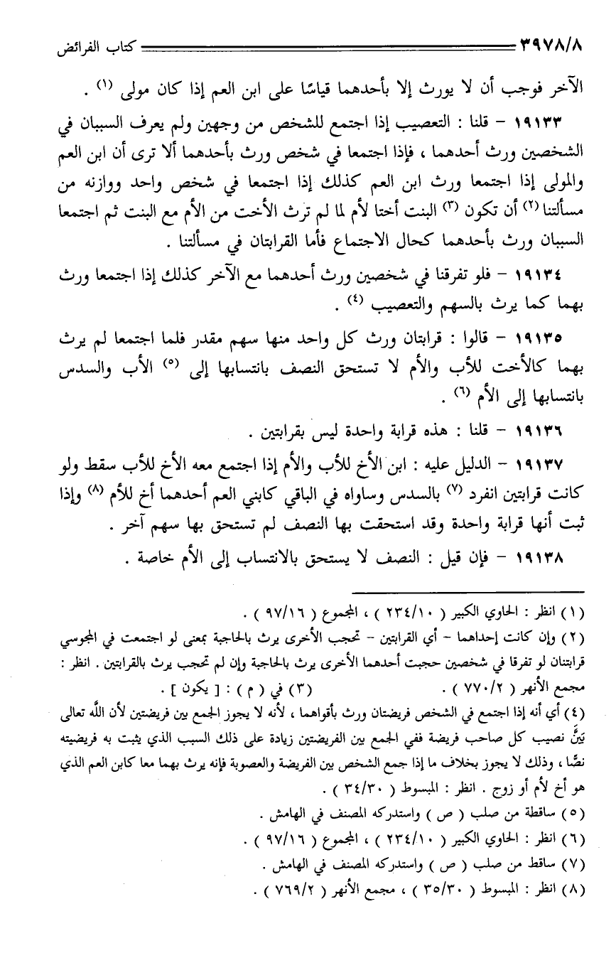 19133 - قلنا: التعصيب إذا اجتمع للشخص من وجهين ولم يعرف السببان في الشخصين ورث أحدهما، فإذا اجتمعا في شخص ورث بأحدهما ألا ترى أن ابن العم والمولى إذا اجتمعا ورث ابن العم كذلك إذا اجتمعا في شخص واحد ووازنه من مسألتنا أن تكون البنت أختا لأم لما لم ترث الأخت من الأم مع البنت ثم اجتمعا السببان ورث بأحدهما كحال الاجتماع فأما القرابتان في مسألتنا.