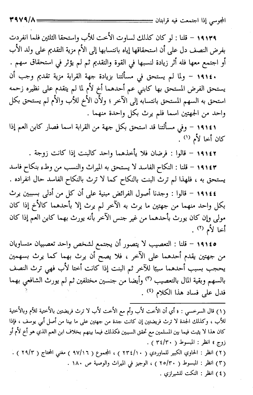 19144 - قالوا: وجدنا أصول الفرائض مبنية على أن كل من أدلى بسببين يرث بكل واحد منهما من جهتين ما يرث به الآخر لم يرث إلا بأحدهما كالأخ إذا كان مولى وإن كان يورث بأحدهما من غير جنس الآخر بأنه يورث بهما كابن العم إذا كان أخا لأم.