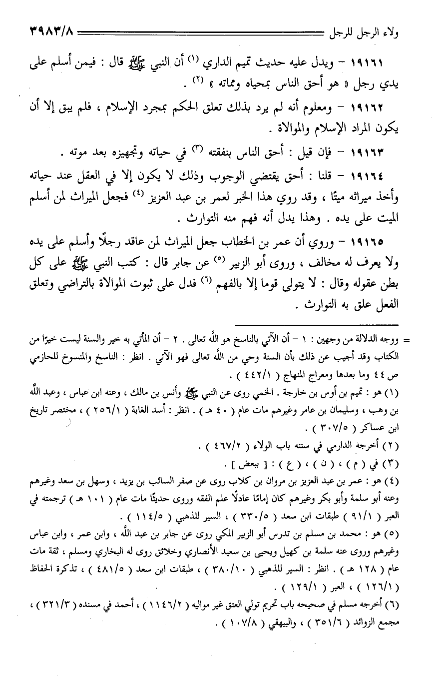 19161 - ويدل عليه حديث تميم الداري أن النبي - صلى الله عليه وسلم - قال: فيمن أسلم على يدي رجل (هو أحق الناس بمحياه ومماته).