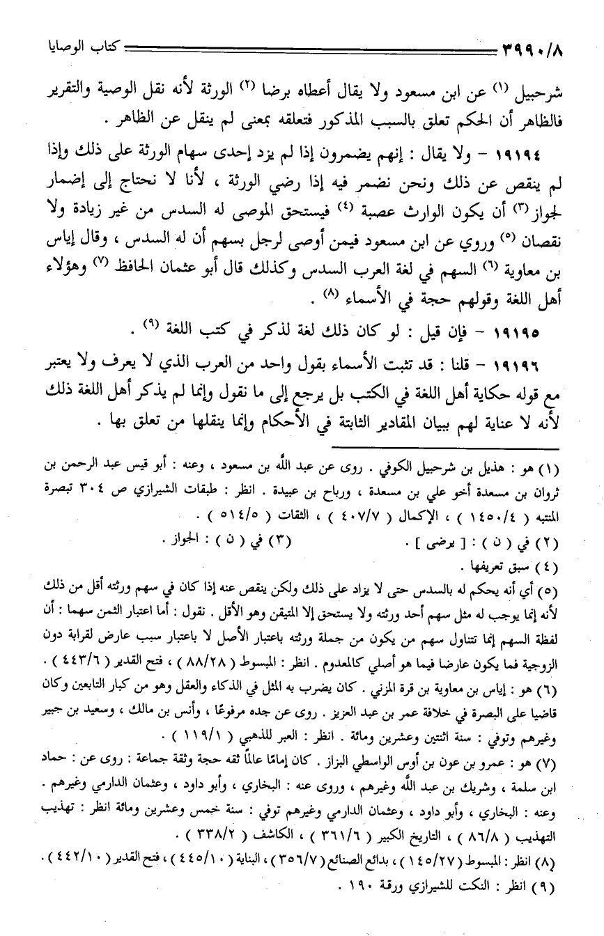 19194 - ولا يقال: إنهم يضمرون إذا لم يزد إحدى سهام الورثة على ذلك وإذا لم ينقص عن ذلك ونحن نضمر فيه إذا رضي الورثة، لأنا لا نحتاج إلى إضمار لجواز أن يكون الوارث عصبة فيستحق الموصى له السدس من غير زيادة ولا نقصان وروي عن ابن مسعود فيمن أوصى لرجل بسهم أن له السدس، وقال إياس بن معاوية السهم في لغة العرب السدس وكذلك قال أبو عثمان الحافظ وهؤلاء أهل اللغة وقولهم حجة في الأسماء.