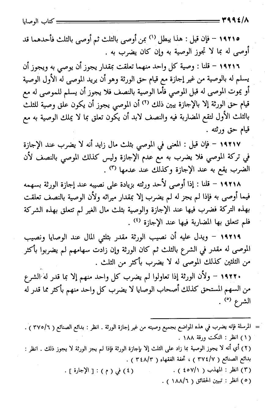 19219 - ويدل عليه أن نصيب الورثة مقدر بثلثي المال عند الوصايا ونصيب الموصى له مقدر في الشرع بالثلث ثم كان الورثة وإن زادت سهامهم لم يضربوا بأكثر من الثلثين كذلك الموصى له لا يضرب بأكثر من الثلث.