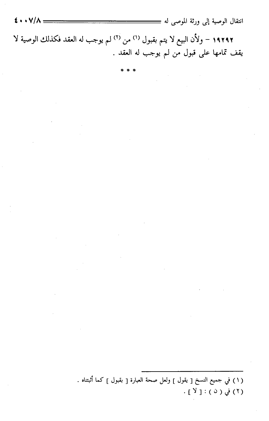19292 - ولأن البيع لا يتم بقبول من لم يوجب له العقد فكذلك الوصية لا يقف تمامها على قبول من لم يوجب له العقد.