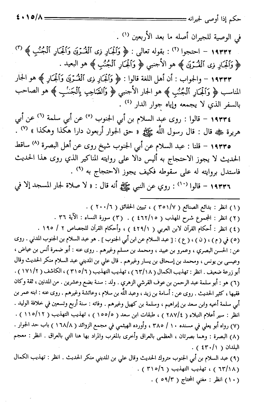 19332 - احتجوا: بقوله تعالى: {والجار ذي القربى والجار الجنب} {والجار ذي القربى} هو الأجنبي {والجار الجنب} هو البعيد.