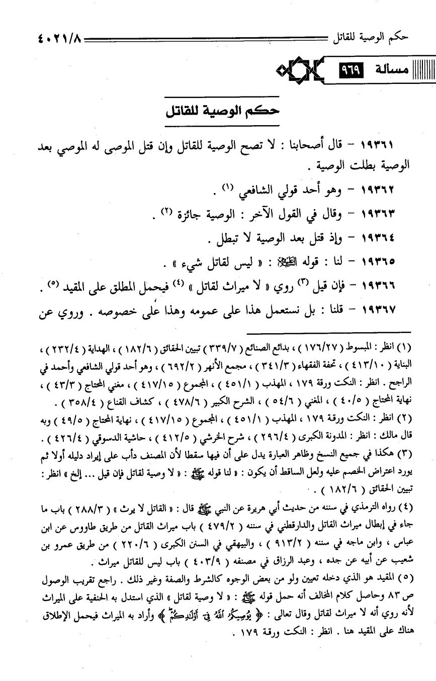 19361 - قال أصحابنا: لا تصح الوصية للقاتل وإن قتل الموصى له الموصي بعد الوصية بطلت الوصية.