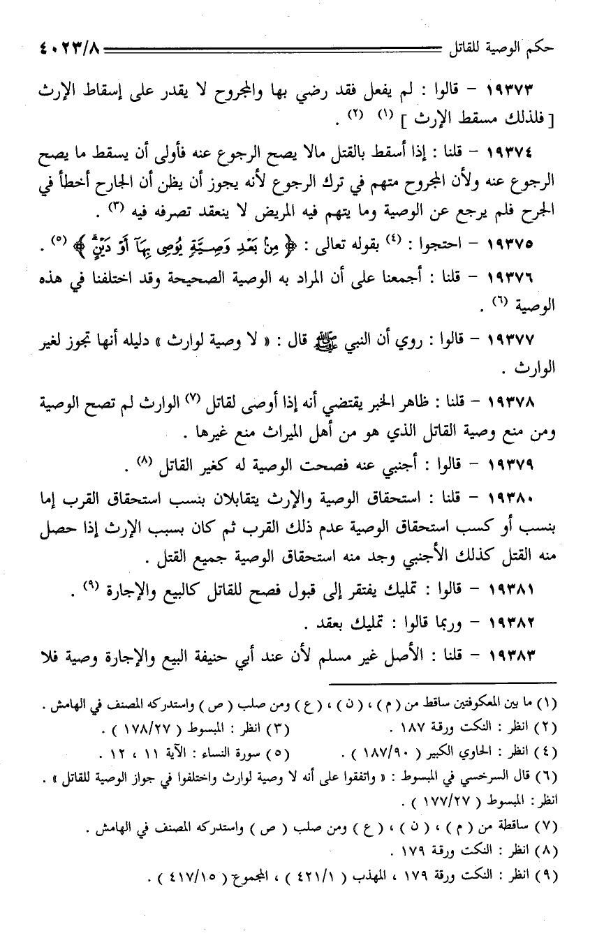 19380 - قلنا: استحقاق الوصية والإرث يتقابلان بنسب استحقاق القرب إما بنسب أو كسب استحقاق الوصية عدم ذلك القرب ثم كان بسبب الإرث إذا حصل منه القتل كذلك الأجنبي وجد منه استحقاق الوصية جميع القتل.
