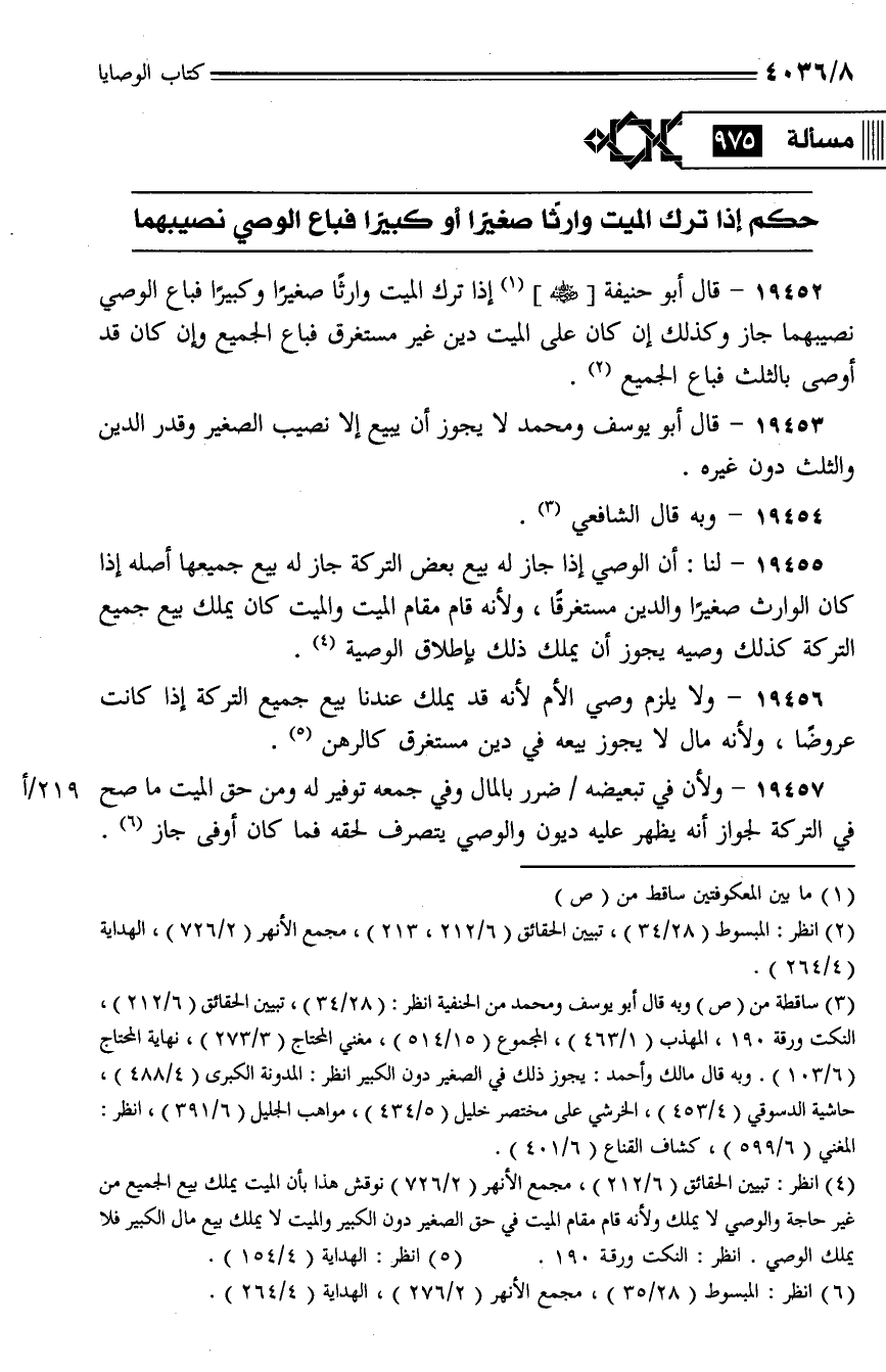 19452 - قال أبو حنيفة [- رضي الله عنه -] إذا ترك الميت وارثا صغيرا وكبيرا فباع الوصي نصيبهما جاز وكذلك إن كان على الميت دين غير مستغرق فباع الجميع وإن كان قد أوصى بالثلث فباع الجميع.