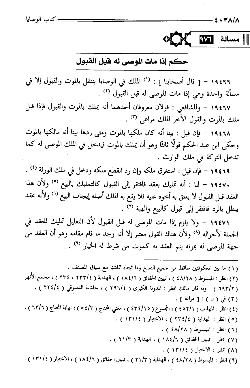 19466 - [قال أصحابنا]: الملك في الوصايا ينتقل بالموت والقبول إلا في مسألة واحدة وهي إذا مات الموصى له قبل القبول.
