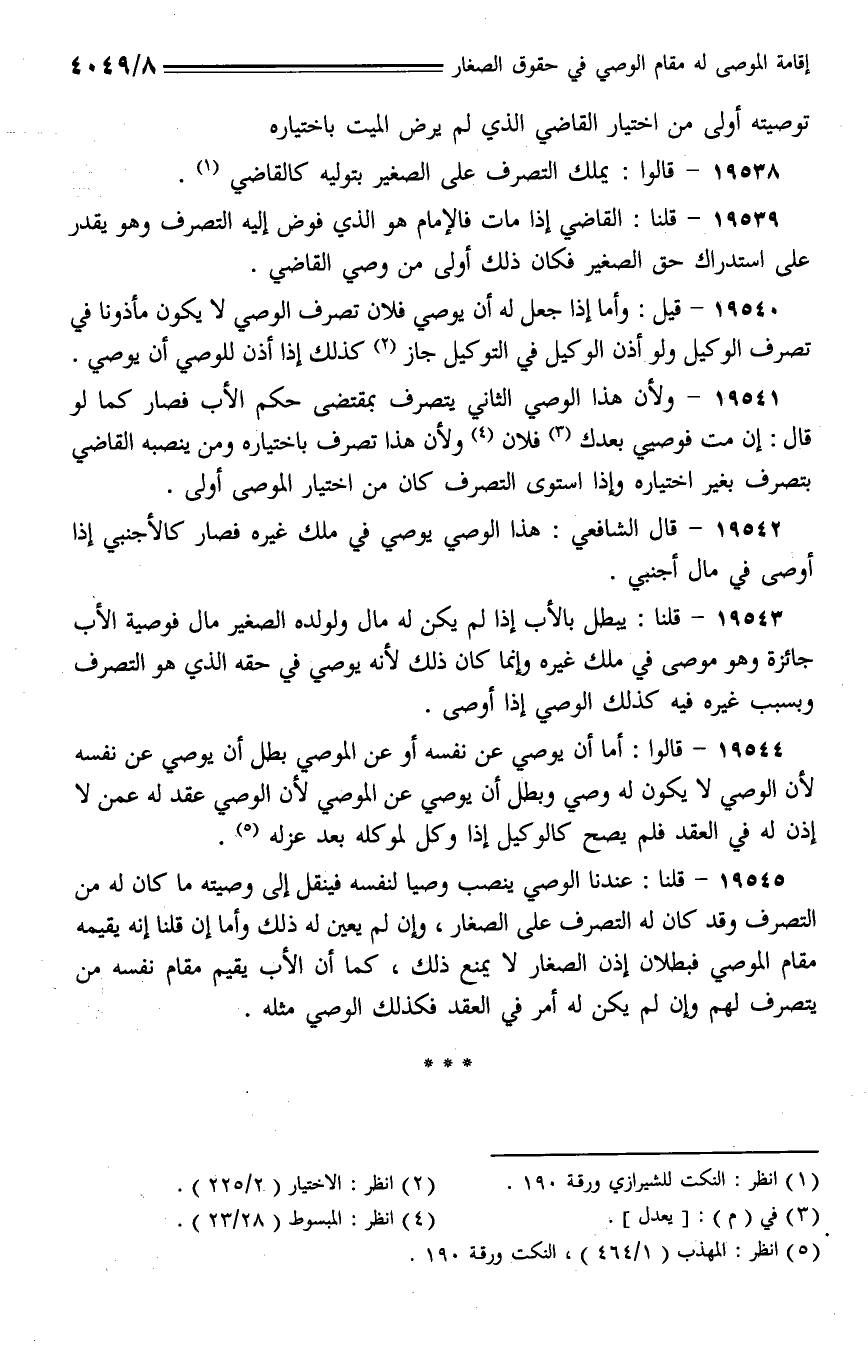 19545 - قلنا: عندنا الوصي ينصب وصيا لنفسه فينقل إلى وصيته ما كان له من التصرف وقد كان له التصرف على الصغار، وإن لم يعين له ذلك وأما إن قلنا إنه يقيمه مقام الموصي فبطلان إذن الصغار لا يمنع ذلك، كما أن الأب يقيم مقام نفسه من يتصرف لهم وإن لم يكن له أمر في العقد فكذلك الوصي مثله