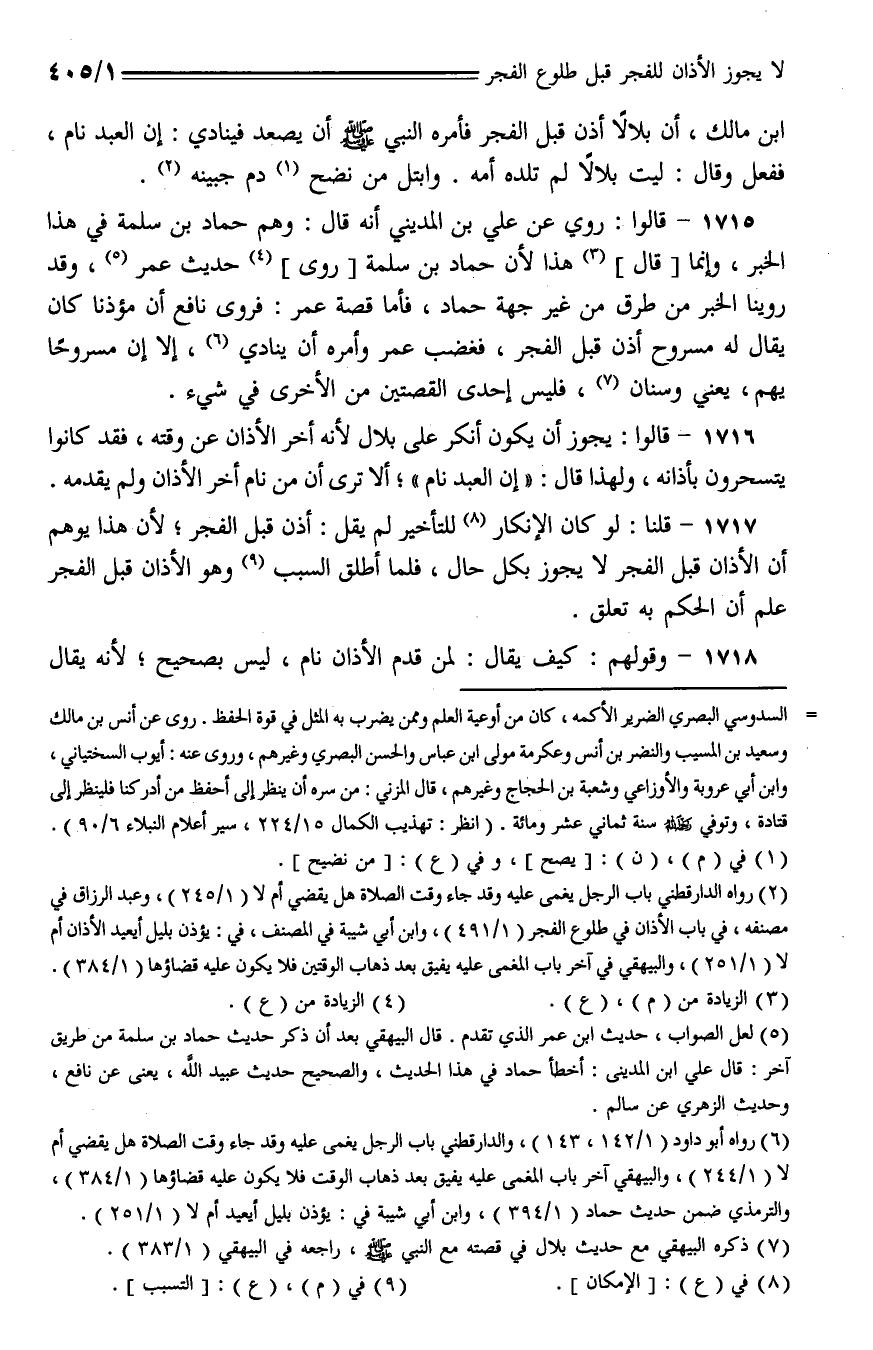 1715 - قالوا: روي عن علي بن المديني أنه قال: وهم حماد بن سلمة في هذا الخبر، وإنما قال هذا لأن حماد بن سلمة روى حديث عمر، وقد روينا الخبر من طرق من غير جهة حماد، فأما قصة عمر: فروى نافع أن مؤذنا كان يقال له مسروح أذن قبل الفجر، فغضب عمر وأمره أن ينادي، إلا إن مسروحًا يهم، يعني وسنان، فليس أحدى القصتين من الأخرى في شيء.