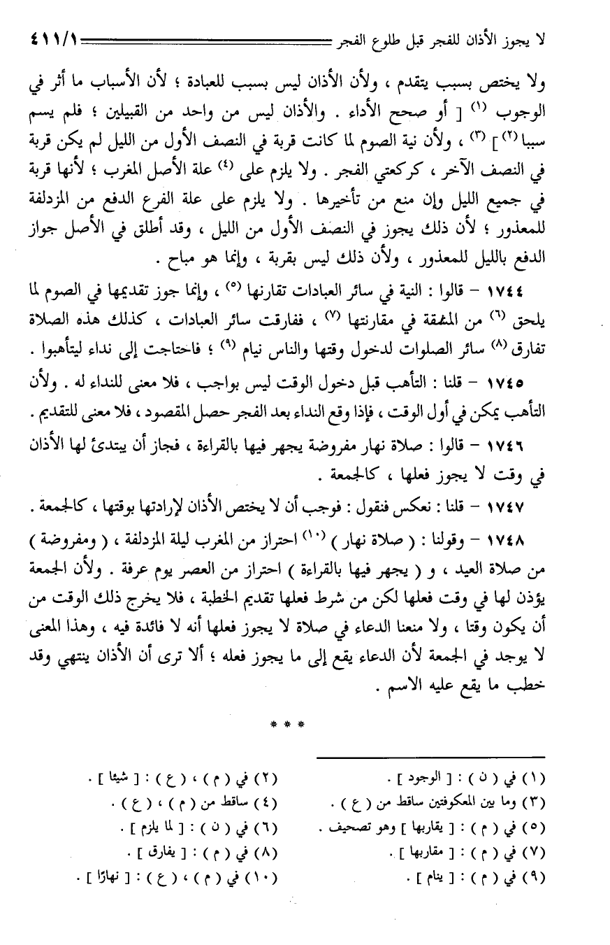 1748 - وقولنا: (صلاة نهار) احتراز من المغرب ليلة المزدلفة، (ومفروضة) من صلاة العيد، و (يجهر فيها القراءة) احتراز من العصر يوم عرفة. ولأن الجمعة يؤذن لها في وقت فعلها لكن من شرط فعلها تقديم الخطبة، فلا يخرج ذلك الوقت من أن يكون وقتا، ولا منعنا الدعاء في صلاة لا يجوز فعلها أنه لا فائدة فيه، وهذا المعنى لا يوجد في الجمعة لأن الدعاء يقع إلى ما يجوز فعله؛ ألا ترى أن الأذان ينتهي وقد خطب ما يقع عليه الاسم.
