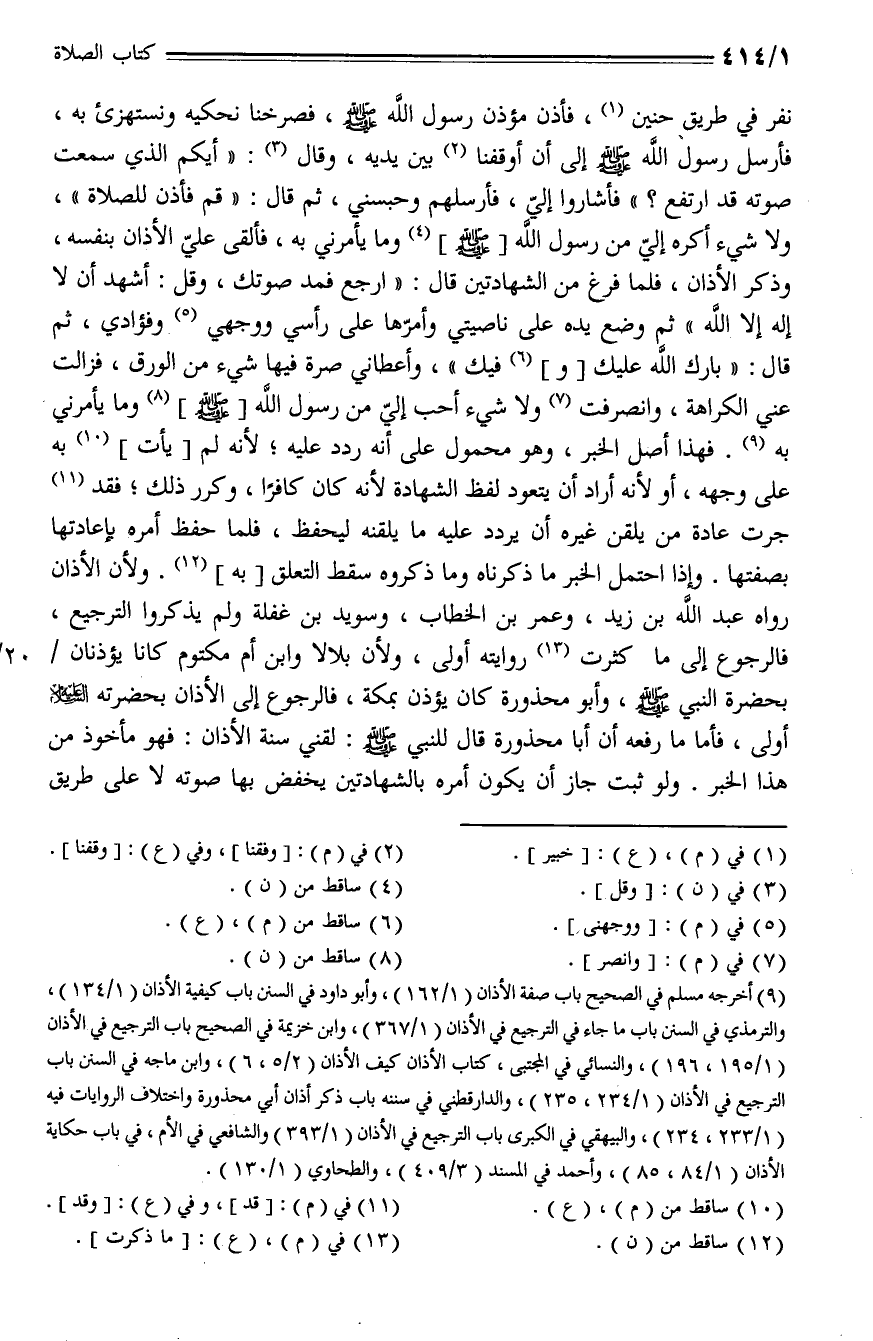 نفر في طريق حنين، فإذن مؤذن رسول الله - صلى الله عليه وسلم -، فصرخنا نحكيه ونستهزئ به، فأرسل رسول الله - صلى الله عليه وسلم - إلى أن أوقفنا بين يديه، وقال: ((أيكم الذي سمعت صوته قد ارتفع؟)) فأشاروا إليّ، فأرسلهم وحبسني، ثم قال: ((قم فأذن للصلاة))، ولا شيء أكره إليّ من رسول الله - صلى الله عليه وسلم - وما يأمرني به، فألقى عليّ الأذان بنفسه، وذكر الأذان، فلما فرغ من الشهادتين قال: ((ارع فمد صوتك، وقل: أشهد أن لا إله إلا الله)) ثم وضع يده على ناصيتي وأمرّها على رأسي ووجهي وفؤادي، ثم قال: ((بارك الله عليك وفيك))، وأعطاني صرة فيها شيء من الورق، فزالت عني الكراهة، وانصرفت ولا شيء أحب إلي من رسول الله - صلى الله عليه وسلم - وما يأمرني به. فهذا أصل الخبر، وهو محمول على أنه ردد عليه؛ لأنه لم يأت به على وجهه، أو لأنه أراد أن يتعود لفظ الشهادة لأنه كان كافرًا، وكرر ذلك؛ فقد جرت عادة من يلقن غيره أن يردد عليه ما يلقنه ليحفظ، فلما حفظ أمره بإعادتها بصفتها. وإذا احتمل الخبر ما ذكرناه وما ذكروه سقط التعلق به. ولأن الأذان رواه عبد الله بن زيد، وعمر بن الخطاب، وسويد بن غفلة ولم يذكروا الترجيع، فالرجوع إلى ما كثرت روايته أولى، ولأن بلالا وابن أم مكتوم كانا يؤذنان بحضرة النبي - صلى الله عليه وسلم -، وأبو محذورة كان يؤذن بمكة، فالرجوع إلى الأذان بحضرته - عليه السلام - أولى، فأما ما رفعه أن أبا محذورة قال للنبي - صلى الله عليه وسلم -: لقني سنة الأذان: فهو مأخوذ من هذا الخبر. ولو ثبت جاز أن يكون أمره بالشهادتين يخفض بها صوته لا على طريق