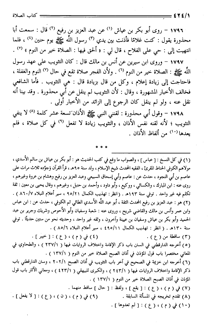 1796 - روى أبو بكر بن عياش عن عبد العزيز بن رفيع قال: سمعت أبا محذورة يقول: كنت غلامًا فأذنت بين يدي رسول الله - صلى الله عليه وسلم - يوم حنين، فلما انتهيت إلى: حي على الفلاح، قال لي ((ألحق فيها: الصلاة خير من النوم)).