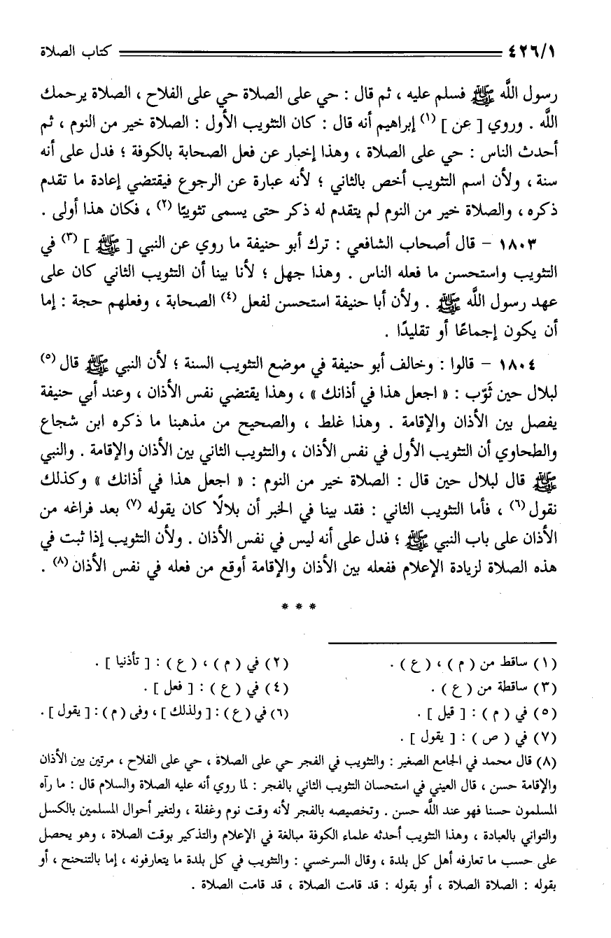 رسول الله - صلى الله عليه وسلم - فسلم عليه، ثم قال: حي على الصلاة حي على الفلاح، الصلاة يرحمك الله. وروي عن إبراهيم أنه قال: كان التثويب الأول: الصلاة خير من النوم، ثم أحدث الناس: حي على الصلاة، وهذا إخبار عن فعل الصحابة بالكوفة؛ فدل على أنه سنة، ولأن اسم التثويب أخص بالثاني؛ لأنه عبارة عن الرجوع فيقتضي إعادة ما تقدم ذكره والصلاة خير من النوم لم يتقدم له ذكر حتى يسمى تثويبًا، فكان هذا أولى.