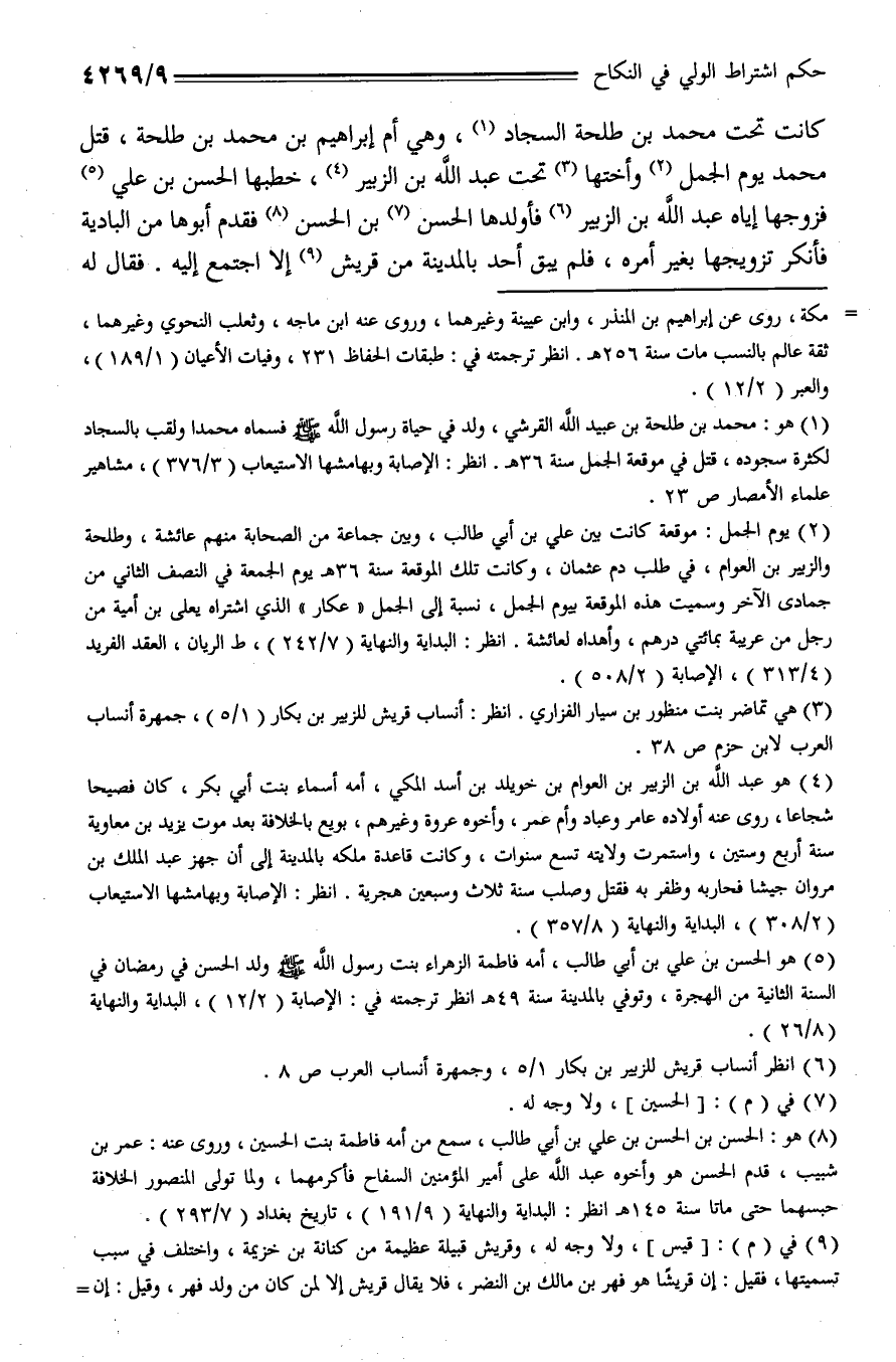 كانت تحت محمد بن طلحة السجاد، وهي أم إبراهيم بن محمد بن طلحة، قتل محمد يوم الجمل وأختها تحت عبد الله بن الزبير، خطبها الحسن بن علي فزوجها إياه عبد الله بن الزبير فأولدها الحسن بن الحسن فقدم أبوها من البادية فأنكر تزويجها بغير أمره، فلم يبق أحد بالمدينة من قريش إلا اجتمع إيه. فقال له