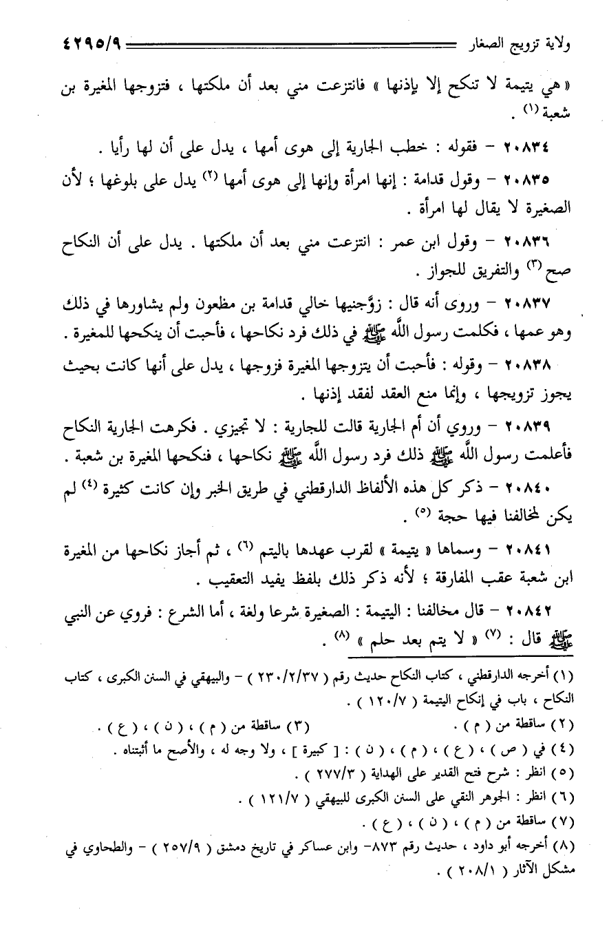 20842 - قال مخالفنا: اليتيمة: الصغيرة شرعا ولغة، أما الشرع: فروي عن النبي - صلى الله عليه وسلم - قال: (لا يتم بعد حلم).