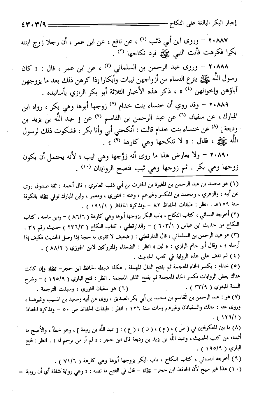 20888 - وروى عبد الرحمن بن السلماني، عن ابن عمر، قال: (كان رسول الله - صلى الله عليه وسلم - ينزع النساء من أزواجهن ثيبات وأبكارًا إذا كرهن ذلك بعد ما يزوجهن آباؤهن وإخوانهن)، ذكر هذه الأخبار الثلاثة أبو بكر الرازي بأسانيده.
