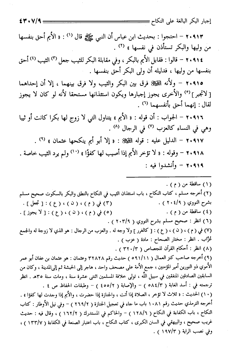 20913 - احتجوا: بحديث ابن عباس أن النبي - صلى الله عليه وسلم - قال: (الأيم أحق بنفسها من وليها والبكر تستأذن في نفسها).