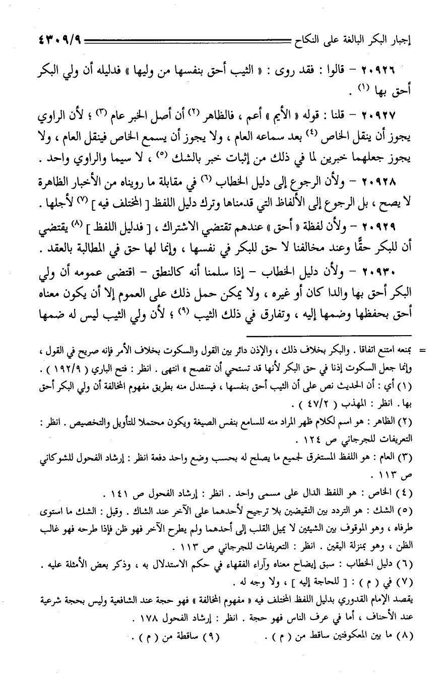 20928 - ولأن الرجوع إلى دليل الخطاب في مقابلة ما رويناه من الأخبار الظاهرة لا يصح، بل الرجوع إلا الألفاظ التي قدمناها وترك دليل اللفظ [المختلف فيه] لأجلها.