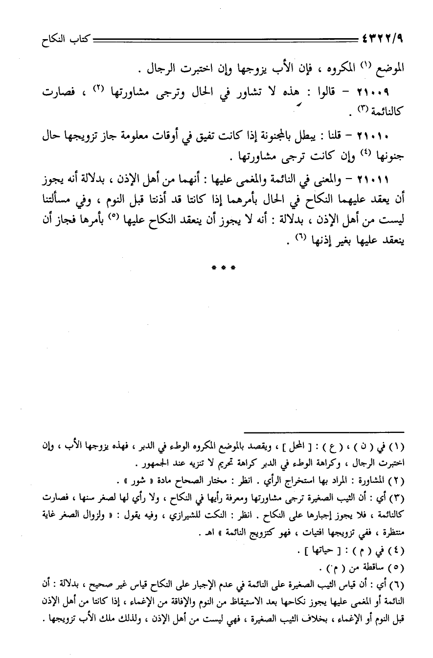 21009 - قالوا: هذه لا تشاور في الحال وترجى مشاورتها، فصارت كالنائمة.