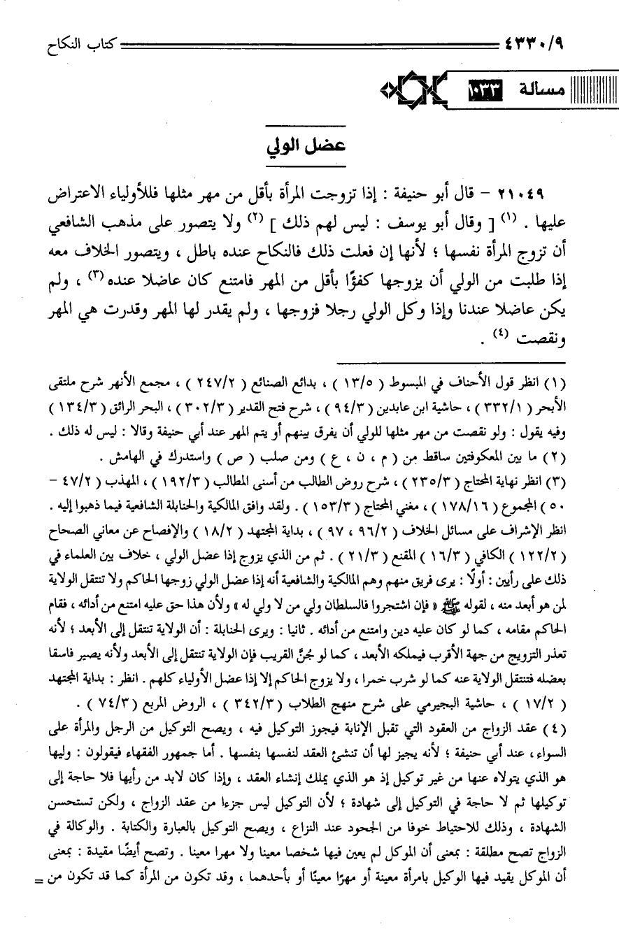 21049 - قال أبو حنيفة: إذا تزوجت المرأة بأقل من مهر مثله فللأولياء الاعتراض عليها. [وقال أبو يوسف: ليس لهم ذلك] ولا يتصور على مذهب الشافعي أن تزوج المرأة نفسها؛ لأنها إن فعلت ذلك فالنكاح عنده باطل، ويتصور الخلاف معه إذا طلبت من الولي أن يزوجها كفؤا بأقل من المهر فامتنع كان عاضلا عنده، ولم يكن عاضلا عندنا وإذا وكل الولي رجلا فزوجها، ولم يقدر لها المهر وقدرت هي المهر ونقصت.