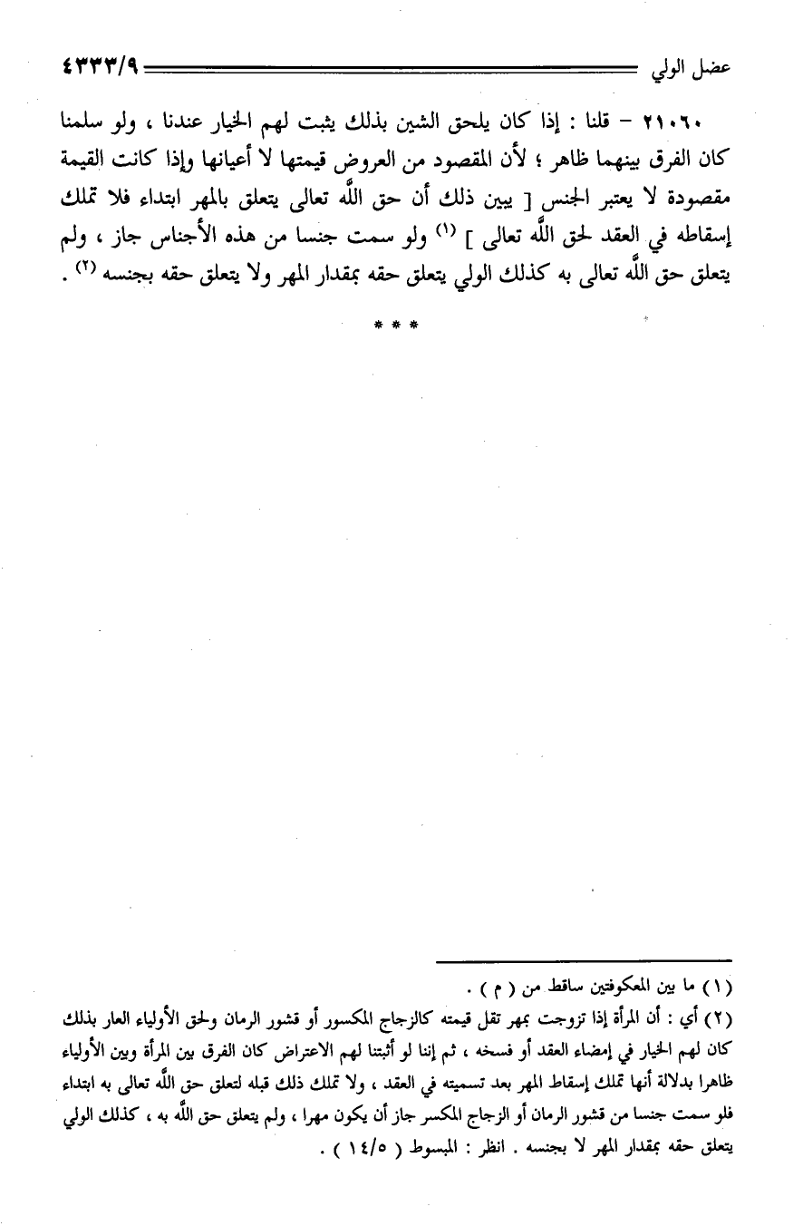 21060 - قلنا: إذا كان يلحق الشين بذلك يثبت لهم الخيار عندنا، ولو سلمنا كان الفرق بينهما ظاهر؛ لأن المقصود من العروض قيمتها لا أعيانها وإذا كانت القيمة مقصودة لا يعتبر الجنس [يبين ذلك أن حق الله تعالى يتعلق بالمهر ابتداء فلا تملك إسقاطه في العقد لحق الله تعالى] ولو سمت جنسا من هذه الأجناس جاز، ولم يتعلق حق الله تعالى به كذلك الولي يتعلق حقه بمقدار المهر ولا يتعلق حقه بجنسه.