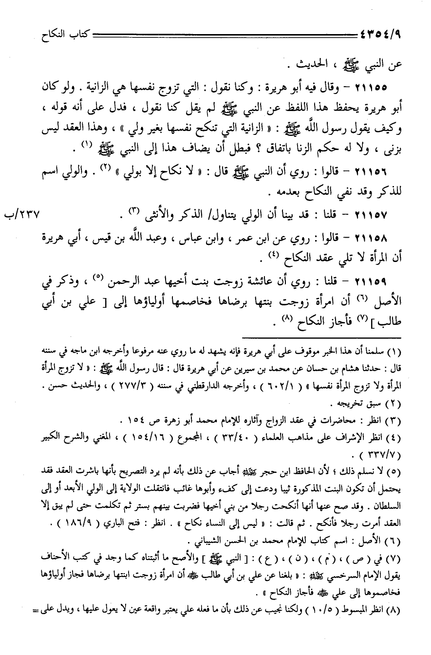 21155 - وقال فيه أبو هريرة: وكنا نقول: التي تزوج نفسها هي الزانية. ولو كان أبو هريرة يحفظ هذا اللفظ عن النبي - صلى الله عليه وسلم - لم يقل كنا نقول، فدل على أنه قوله، وكيف يقول رسول الله - صلى الله عليه وسلم -: (الزانية التي تنكح نفسها بغير ولي)، وهذا العقد ليس بزنى، ولا له حكم الزنا باتفاق؟ فبطل أن يضاف هذا إلى النبي - صلى الله عليه وسلم -.