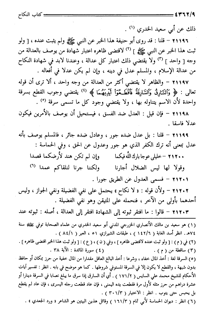 21196 - قلنا: قد روى أبو حنيفة هذا الخبر عن النبي - صلى الله عليه وسلم - ولم يثبت عنده، [ولو ثبت هذا الخبر عن النبي - صلى الله عليه وسلم -] لاقتضى ظاهره اعتبار شهادة من يوصف بالعدالة من وجه [واحد] ولا يقتضي ذلك اعتبار كل عدالة، وعندنا لابد في شهادة النكاح من عدالة الإسلام، والمسلم عدل في دينه، وإن لم يكن عدلا في أفعاله.