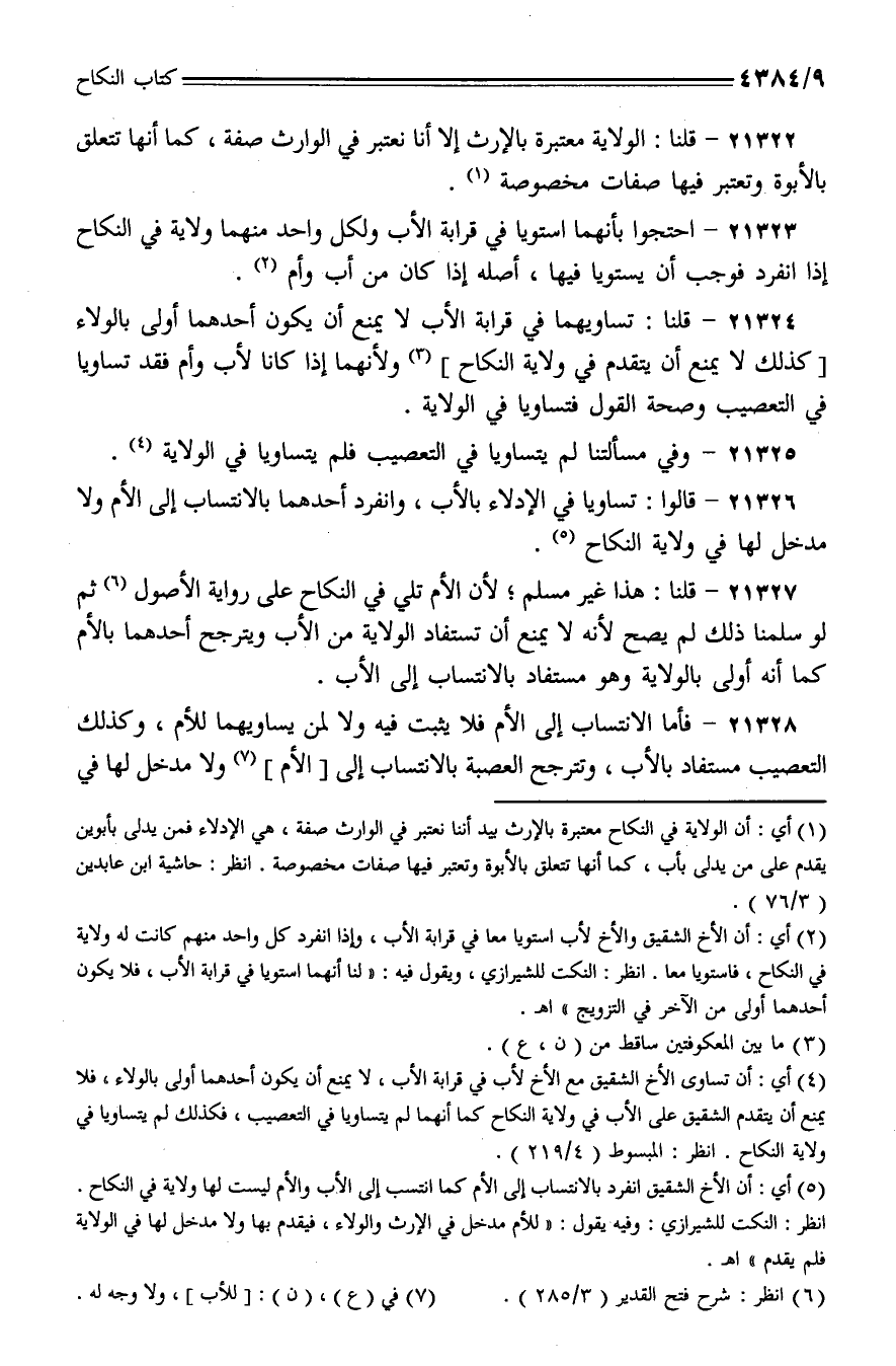 21327 - قلنا: هذا غير مسلم؛ لأن الأم تلي في النكاح على رواية الأصول ثم لو سلمنا ذلك لم يصح لأنه لا يمنع أن تستفاد الولاية من الأب ويترجح أحدهما بالأم كما أنه أولى بالولاية وهو مستفاد بالانتساب إلى الأب.
